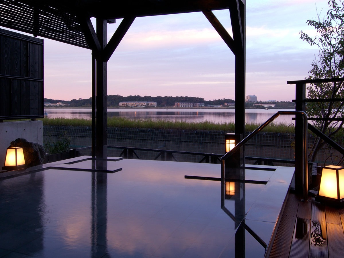 夏は湖上の花火を観ながら、冬は銀世界の中で…片山津の四季に移ろう湖面の彩りは飽きが来ることはありません。柴山潟から望む白山連峰、湖上噴水、一日に七色に変わる湖の色を、露天風呂から心ゆくまでお楽しみ下さい。片山津温泉の泉質は、含塩化土類食塩泉で泉温は73度、湯冷めしにくく女性に多い冷え性を解消してくれるといわれています。